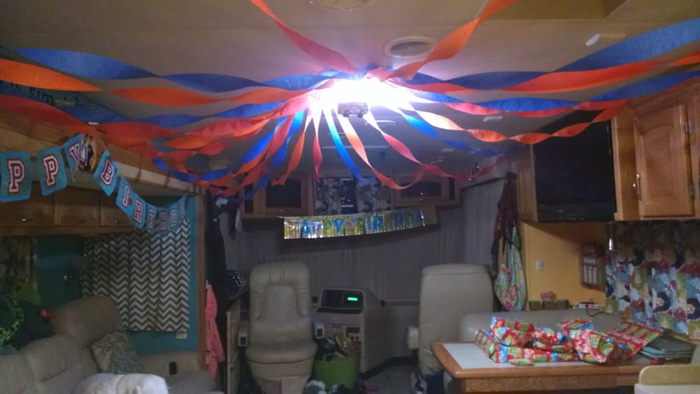 When the kids were sleeping we decorated the RV with streamers and birthday banners. Melia got a High School Musical Birthday Banner and Cannon got cardboard minecraft figurines!