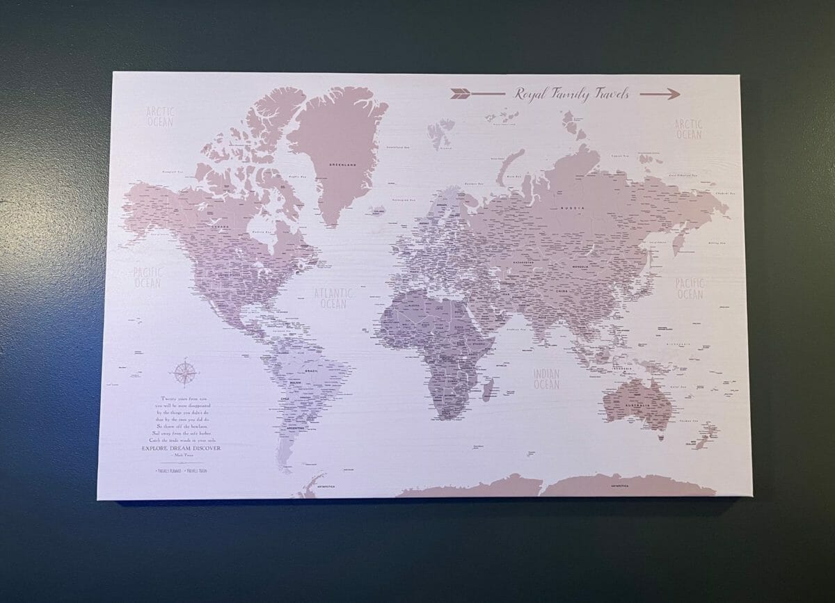 We just got our personalized world map (see our name in the upper right hand corner: Royal Family Travels) from Holy Cow Canvas up on the wall in the living room and will be adding push pins of all the places we have gone and all the places we still want to go!