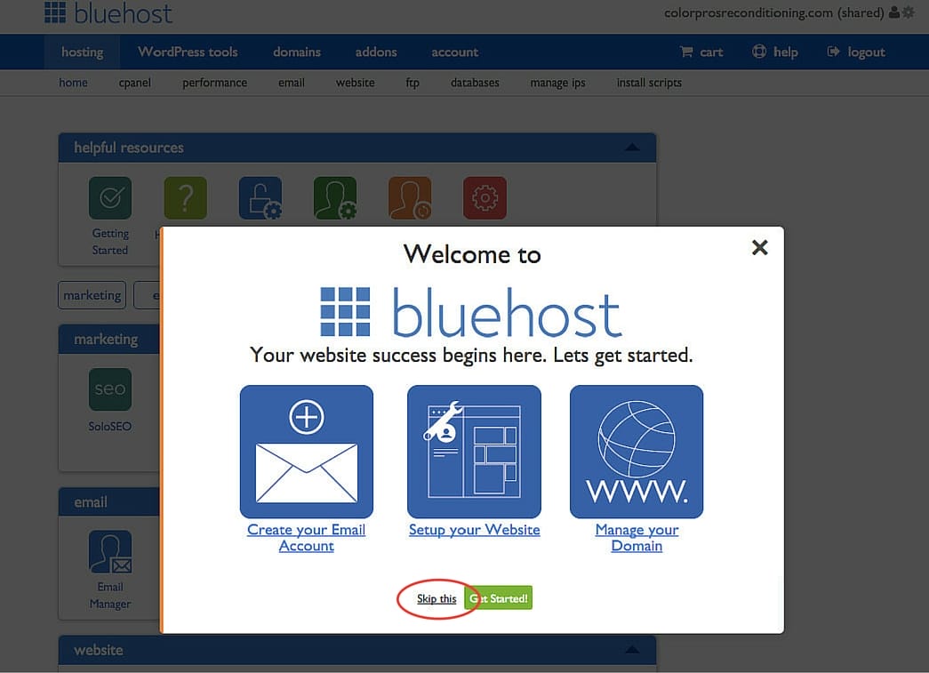 10. Ok! You’re in! Welcome to Bluehost’s CPanel (short for control panel. Those tricky buggers). Once you get there, you’ll see a welcome window pop up giving you 3 options: Create your Email Account, Setup your Website and Manage your Domain.