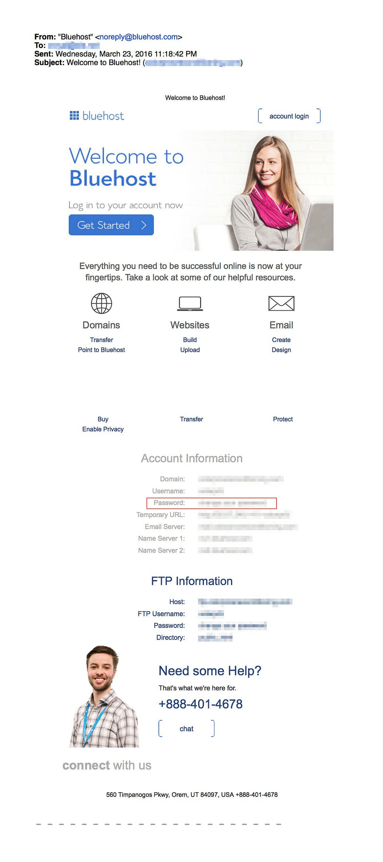 8. Bluehost will send you an email with your login information. This will go to the email address you entered earlier. Go out to your email and find it. It will look like this.