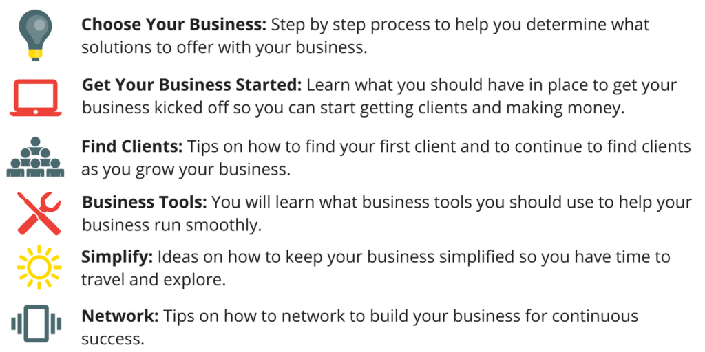 Not sure what business to start? At the beginning of the course, we will walk through how to figure out what the best business is for YOU. You want your business to be something you enjoy, that makes you money and allows you to travel.