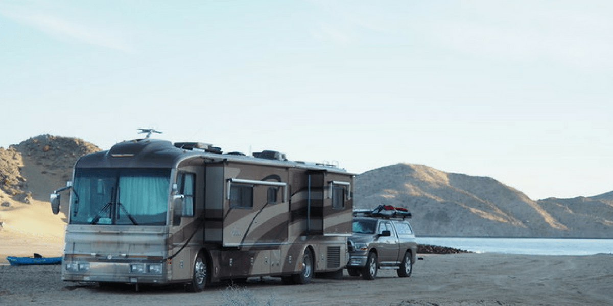 We are so excited to have Jesse and Jenny from Outside Is Calling here to share their adventures traveling through Baja, Mexico in their 40 foot Diesel Pusher motorhome towing a pickup truck . . . yes you read that right! We totally didn’t think it was possible but after running into Jesse and Jenny in La Paz we were convinced it was! Here are the details on their trip RV Baja, California with a 40 foot motorhome and a baby!