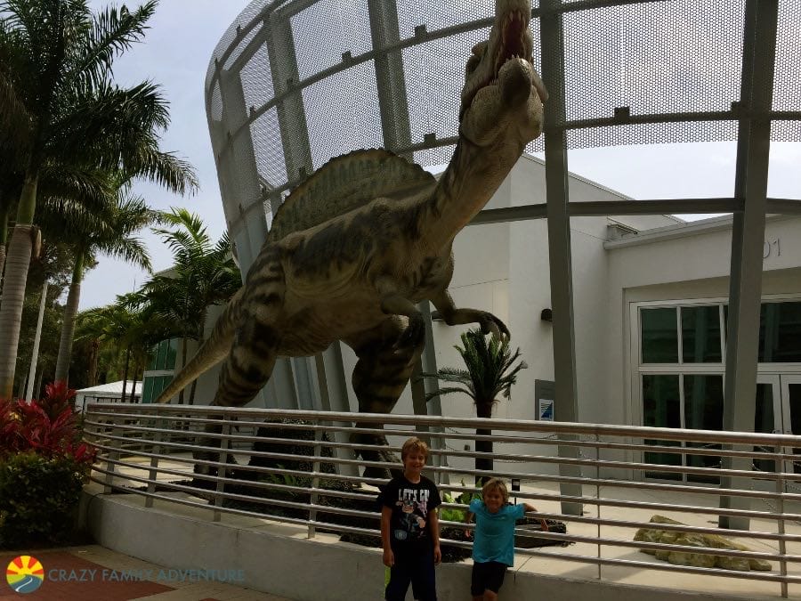When we pulled up to the Cox Science Center and Aquarium (formerly known as the South Florida Science Center and Aquarium) our kids went CRAZY! There was a dinosaur outside the front of the building and he was moving. It looked so real. The kids wanted to run over right away to check it out.