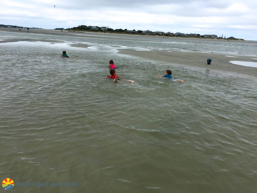 A ways down the beach there was a huge sandbar that looked really cool, so we headed that way. The sandbar took us like 20 yards from the beach into the ocean, so if the tide came in, we’d be trouble. It was a really unique place to play! All of a sudden about 20 feet off of the sand we saw dolphins swimming! It was really neat to see them so close.