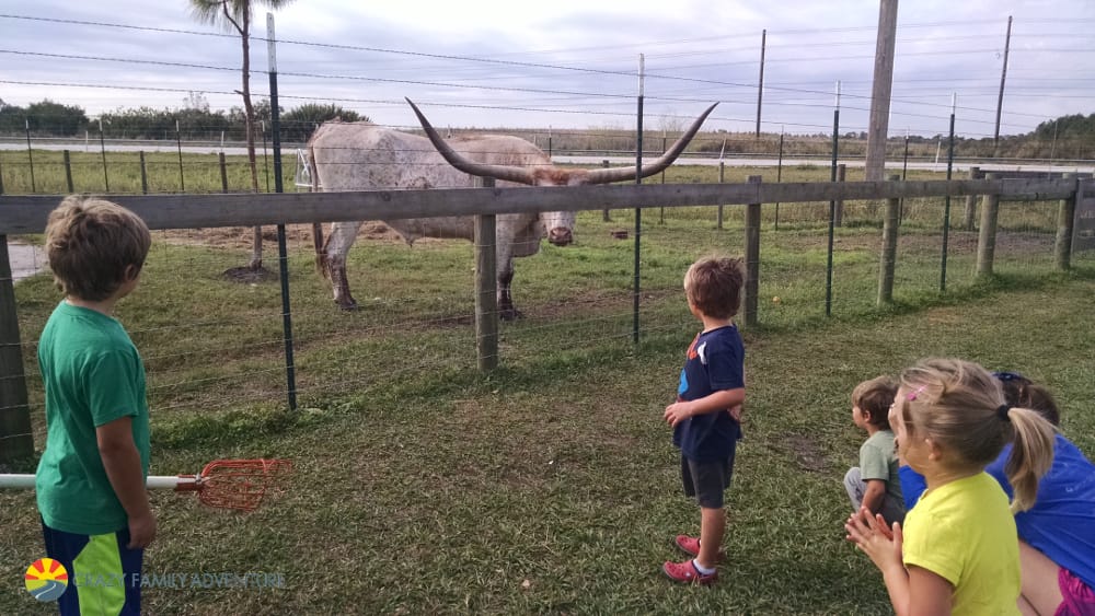 Once we were done we headed back and made a stop by the animals. They had a huge longhorn bull. Tip: Don’t try to pet the bull. He seemed really friendly and kept following us around and snorting for us to come back by him. But when I tried to go closer he almost got me with his horns!