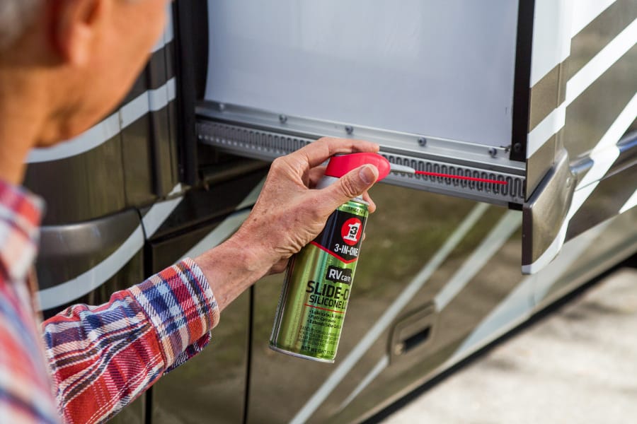 I simply sprayed all surfaces of the slide out tracks and that was all it needed. It took only a few seconds and can be done any time. I especially like this if your RV has been in storage for a while and needs a bit of lubricant to open things up smoothly.