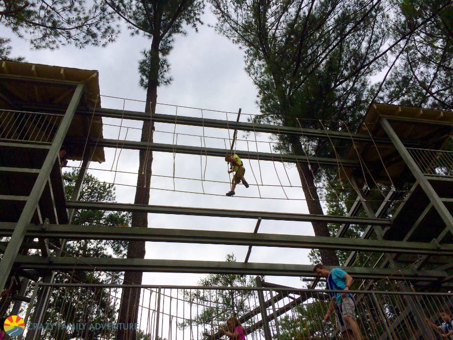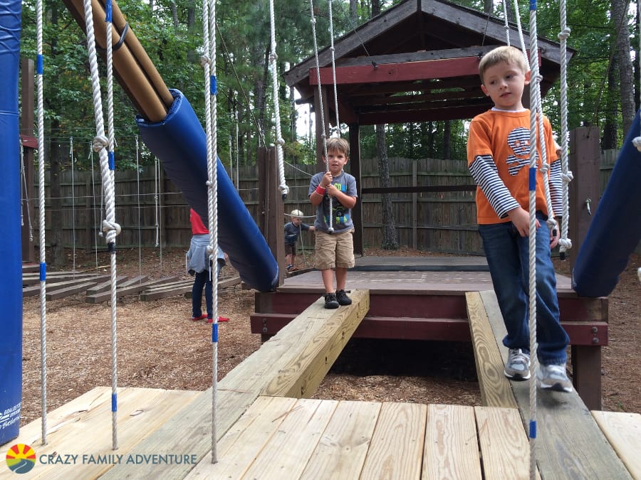 While the 3 older kids and Bryanna worked up SkyHike, Knox and I went just behind it to Camp Highland Post. This is a smaller ropes course designed for little tykes. I had a blast watching Knox as he had to figure out how to maneuver his body and feet to get across some of the obstacles. It was a great way for him to learn coordination and balance!