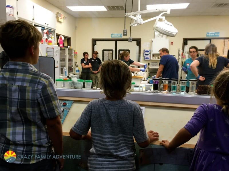 You can also watch them working on the turtles through a glass window. It is really cool to watch how they are able to help the turtles. Then in the back, in the actual hospital area, you can see where the turtles are living and they give talks and feedings to help you learn even more.