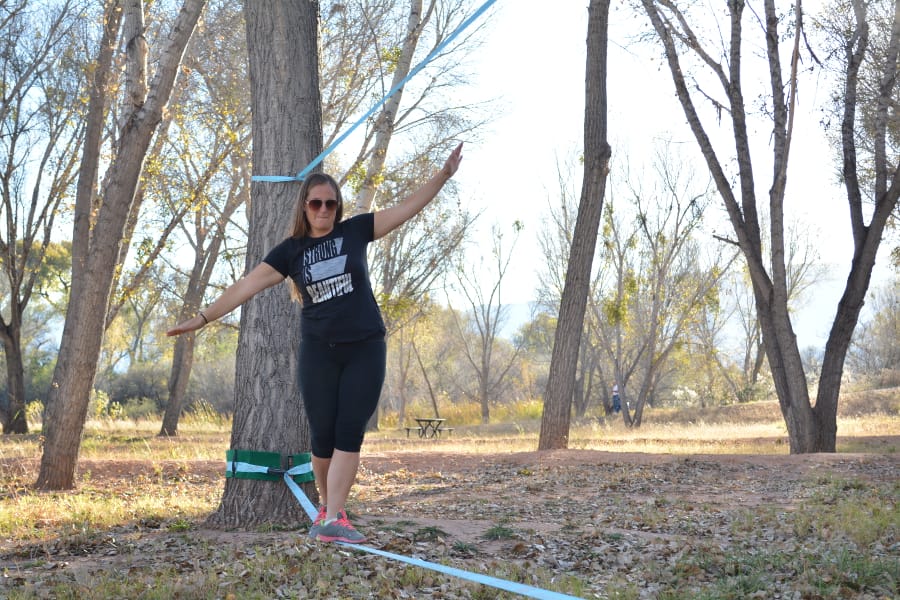Think of a tightrope without the Grand Canyon underneath. You can put the slackline as high or as low as you feel comfortable and practice your balancing as you stand and eventually walk on it.