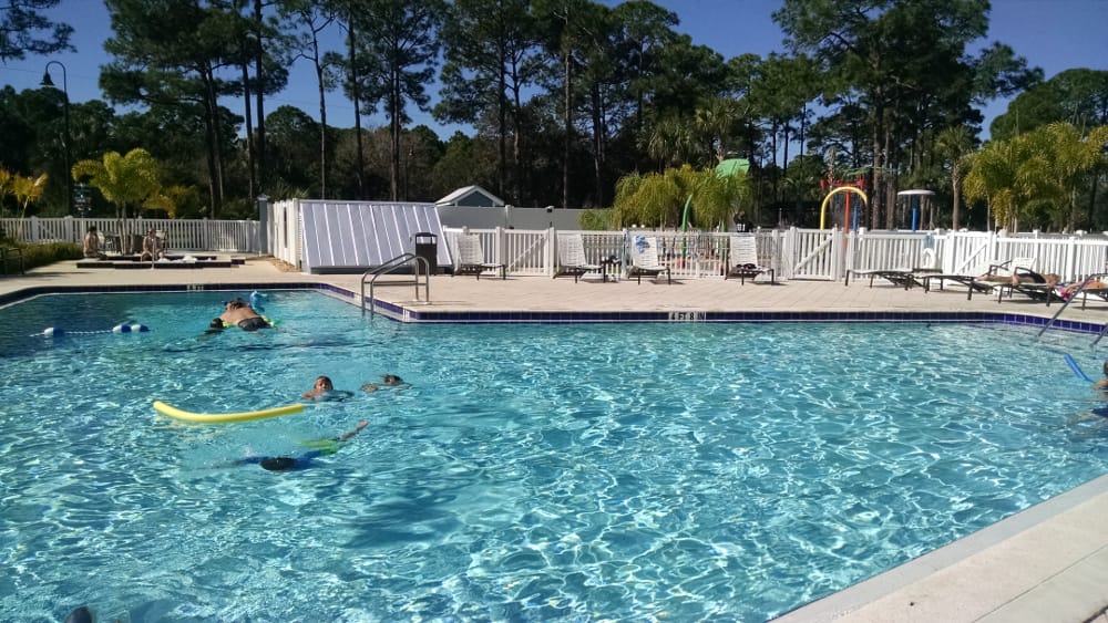 The next day we headed to the pool at our resort and this is when our opinion of the place changed! Their pool area was gorgeous and so was the playground, tennis courts, splash pad, hot tub, etc! We spent the rest of the afternoon swimming and felt like we would definitely come back and stay again. They really build an amazing community at these RV resorts. They offer everything from Bingo to Genealogy class to Self Defense classes. There are things going on ALL the time! And people walking and riding their bikes everywhere. Yes most of the people are over 55 years old and don’t have kids. But they were all very inviting to us and seemed to be enjoying themselves! That night my parents watched the kids again! 2 nights in a row – we will take it! It was so nice to get time to just hang out with Craig – that happens very few and far between with this lifestyle! Thanks Mom and Dad!